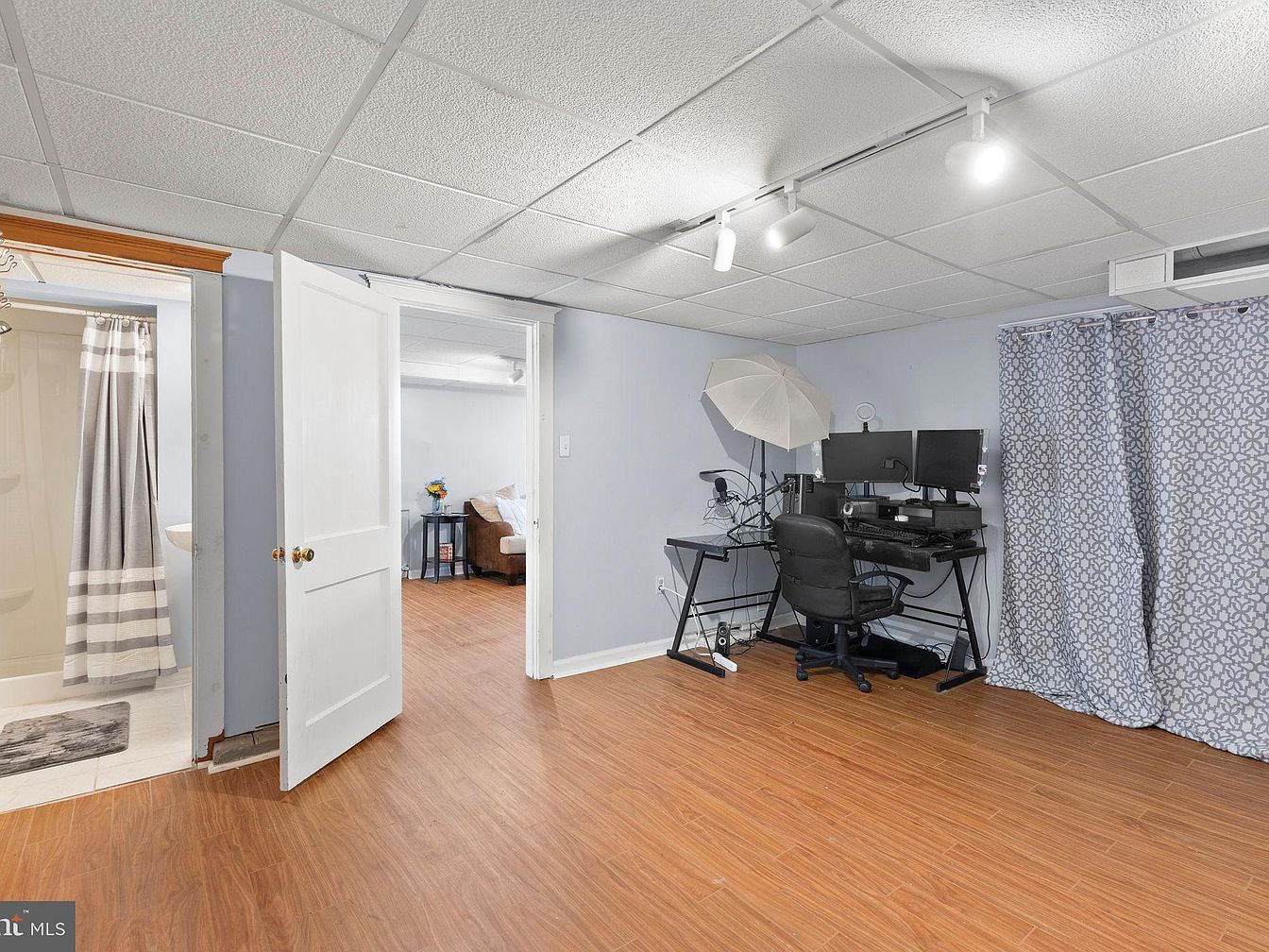 This space features a practical home office setup adjacent to a bathroom, highlighting efficient use of a basement or lower-level area. Light gray walls and white ceiling tiles create a neutral, calming backdrop, complemented by warm wood-look laminate flooring. The office area includes a black desk with dual monitors, a rolling office chair, and photography lighting equipment, suggesting a creative or tech-oriented workspace. A patterned gray curtain provides a subtle decorative touch and conceals additional storage or utilities. The open doorway reveals a glimpse of a cozy living area beyond, while the bathroom is modestly outfitted with a neutral striped shower curtain and basic fixtures.