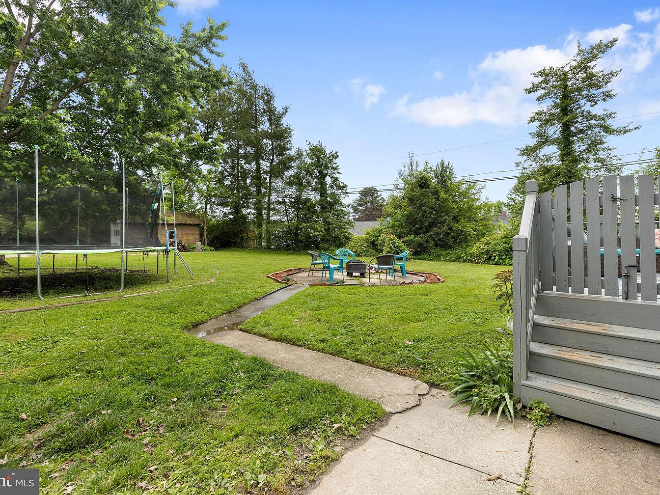 This spacious backyard features a lush green lawn extending to mature trees providing privacy and natural shade. A curved concrete pathway leads from a set of gray-painted wooden stairs toward a circular firepit area surrounded by a mix of blue and black outdoor chairs. The firepit is set in a stone-bordered circle accented by mulch, creating a cozy and inviting focal point for gatherings. To the left, a large trampoline adds a playful touch. The overall layout balances open lawn space with functional zones, under a clear blue sky, evoking a blend of casual comfort and outdoor leisure.