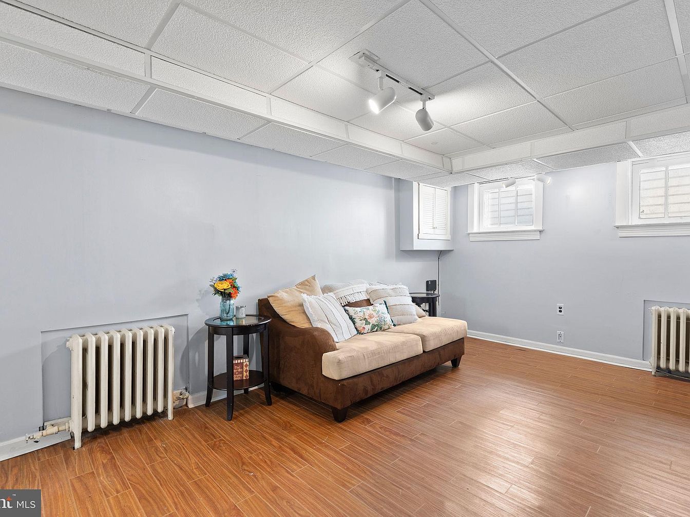 This cozy basement sitting area features soft light gray walls balanced by warm wood-tone flooring, creating a comfortable and inviting atmosphere. A two-tone brown suede couch crowns the space, adorned with a variety of plush, patterned throw pillows that add texture and color. The room is practical with two small black side tables flanking the sofa, one accented by a floral arrangement. Radiators beneath two small, shuttered windows hint at warmth and ventilation. White drop ceiling panels with track lighting provide illumination while maintaining a simple, functional design.