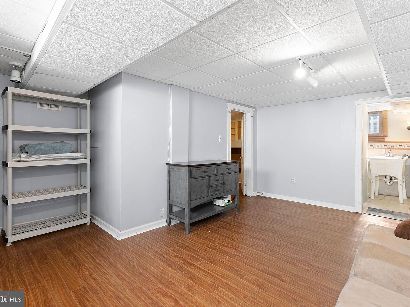 This basement space features a clean, functional design with light gray walls that enhance the room’s brightness despite its lower-level location. The ceiling is composed of white drop tiles with installed track lighting for practical illumination. The flooring mimics natural wood in warm tones, adding a cozy, inviting touch. Furnishings include a simple gray storage cabinet with multiple drawers and a white plastic shelving unit holding folded linens. The room opens into an adjoining laundry or utility area visible through a doorway, showcasing a utility sink and wall cabinets in a classic cream finish, emphasizing versatility and utility.