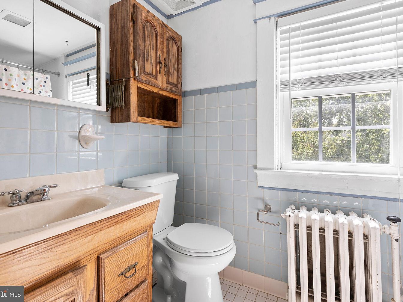 This bathroom features a classic layout with soft pastel blue ceramic tiles covering the lower half of the walls, paired with a white upper half for a clean and bright ambiance. The wooden vanity with a beige countertop and integrated sink adds warmth and rustic charm, complemented by matching overhead cabinet storage with ornate detailing. The white toilet fits neatly in the corner beside a large window with white blinds, allowing natural light to fill the space. A white cast-iron radiator below the window evokes vintage style, enhancing the room’s cozy and timeless aesthetic.