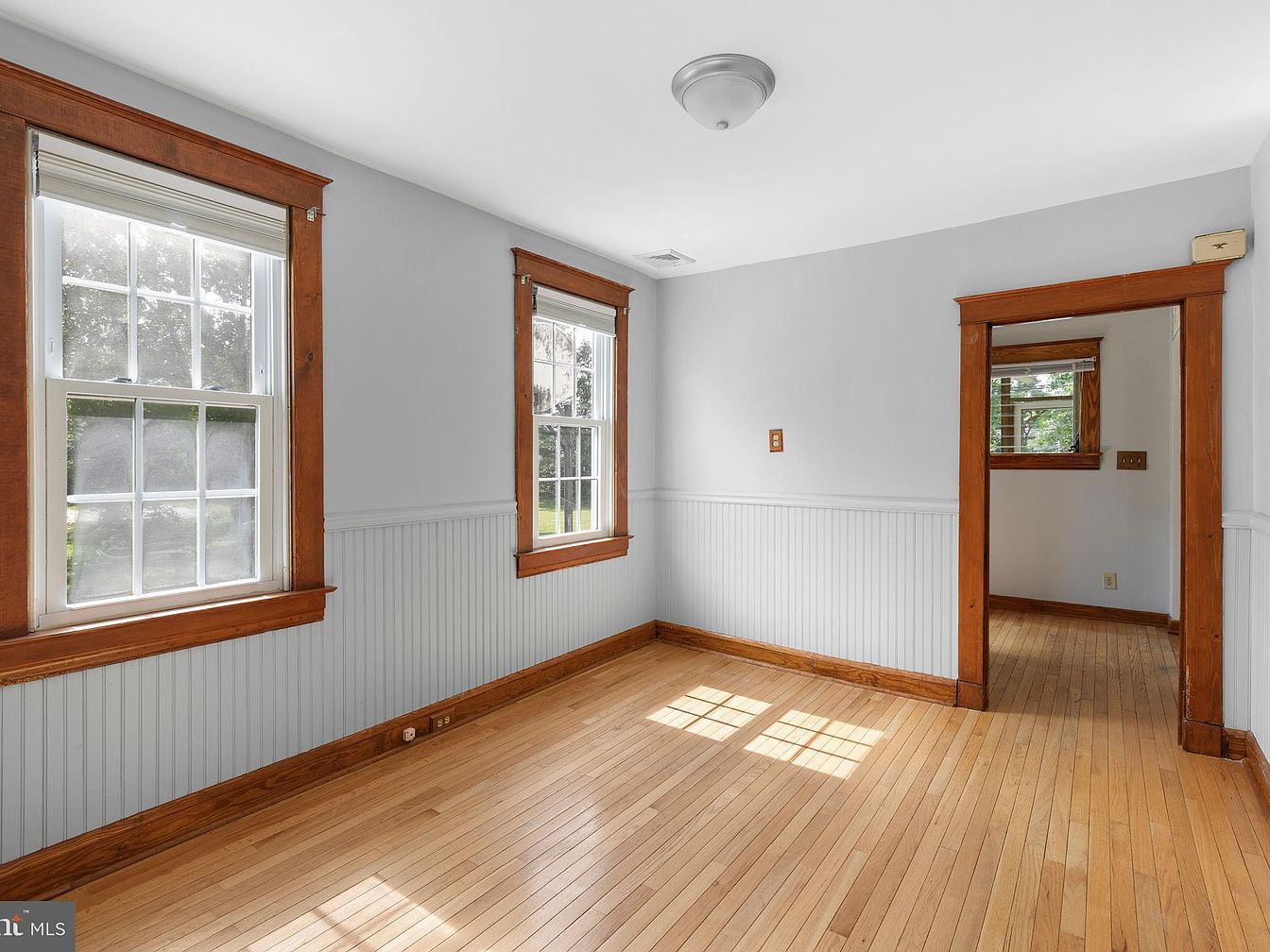 This cozy sitting room features two large, grid-style double-hung windows framed with warm, natural wood trim that complements the hardwood floor’s honey finish. The walls are painted a soft, neutral gray above white beadboard wainscoting, adding texture and a classic touch. A simple, flush-mount ceiling fixture provides overhead lighting while the sunlight streaming through the windows brightens the space. The open doorway with matching wood trim leads to an adjacent room, continuing the traditional aesthetic. The room’s clean lines and natural color palette create an inviting, peaceful ambiance ideal for relaxing or reading.