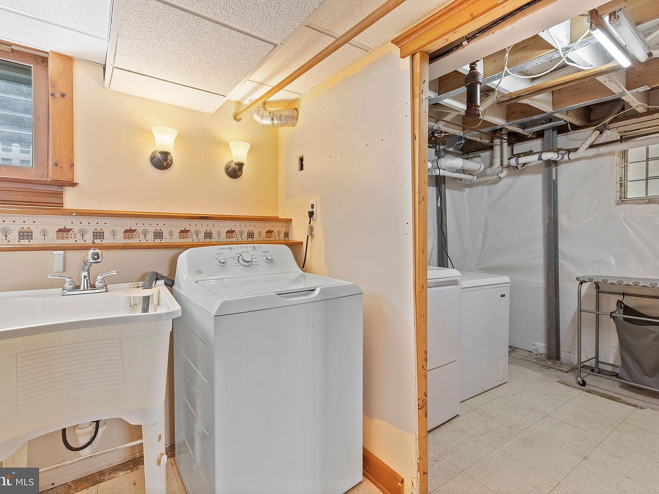 This laundry space is located in a partially finished basement, combining functional utility with a modest vintage charm. On one side, a white top-loading washing machine stands adjacent to a deep utility sink with dual chrome faucets, positioned below a narrow window framed in warm wood trim. The walls are a soft cream tone, enhanced by a rustic wallpaper border featuring a quaint village motif. Above the washer, two soft-glow wall sconces provide ambient lighting. Beyond a wood-trimmed open doorway, the adjoining section reveals exposed ceiling beams, visible pipes, and a dryer, blending raw industrial elements with everyday practicality in this basement laundry setup.