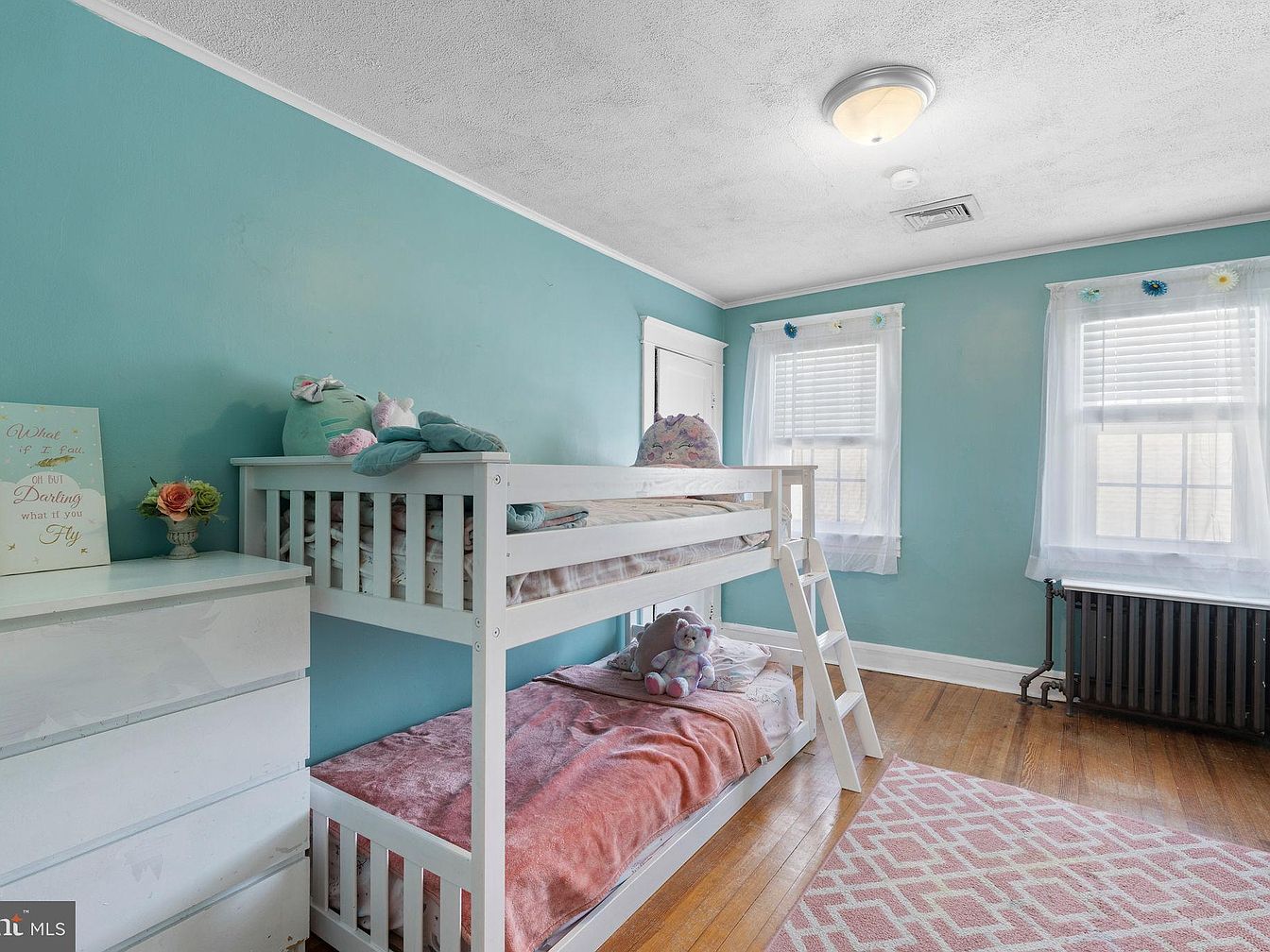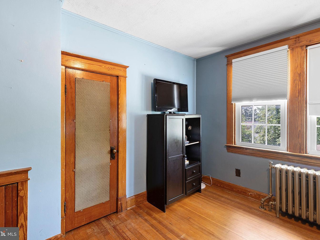 This bedroom corner features soft blue walls complemented by warm, honey-toned wood trim and flooring, establishing a cozy and inviting atmosphere. A wooden door with a fabric panel adds texture and charm. Natural light filters through two windows framed in rich wood, partly covered by white pleated blinds that maintain privacy while brightening the space. A black storage cabinet beneath a mounted flat-screen TV offers functional media entertainment and practical storage. A traditional cast iron radiator sits below the windows, grounding the room with a touch of vintage character.