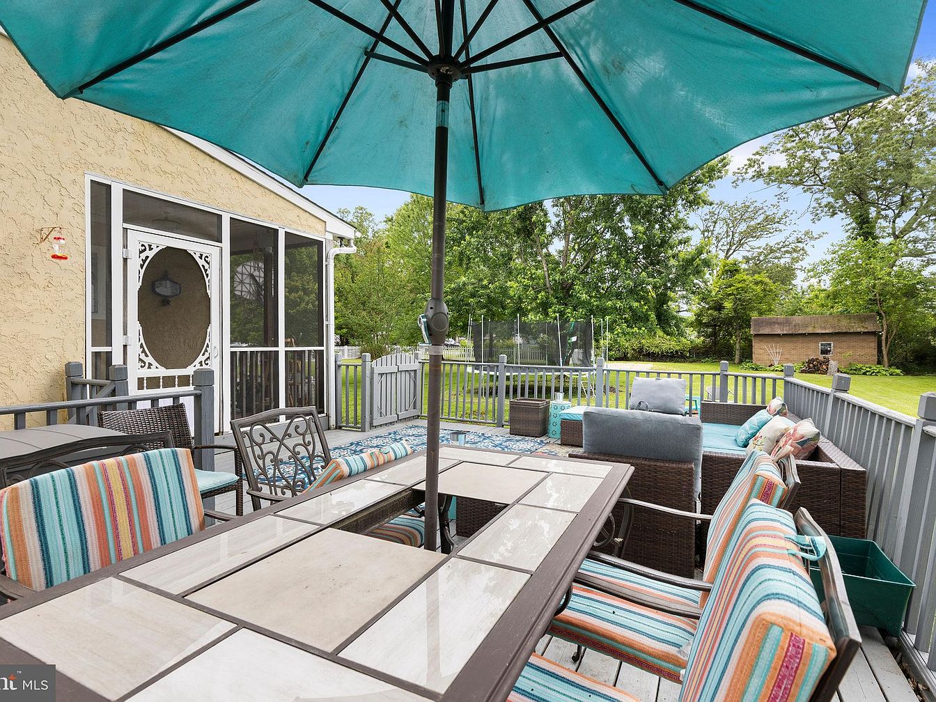 This inviting backyard deck is designed for comfortable outdoor living, featuring a large rectangular tiled table surrounded by metal chairs cushioned with colorful striped fabric. A sizable teal umbrella provides ample shade, adding vibrant contrast to the neutral surroundings. The deck railing is painted a soft gray, complementing the beige stucco exterior walls of the home. Beyond the deck is a lush green lawn dotted with trees and a distant brick shed, creating a peaceful natural backdrop. Cozy wicker seating with pastel cushions and matching patterned rugs complete the ensemble, perfect for relaxation and gatherings.