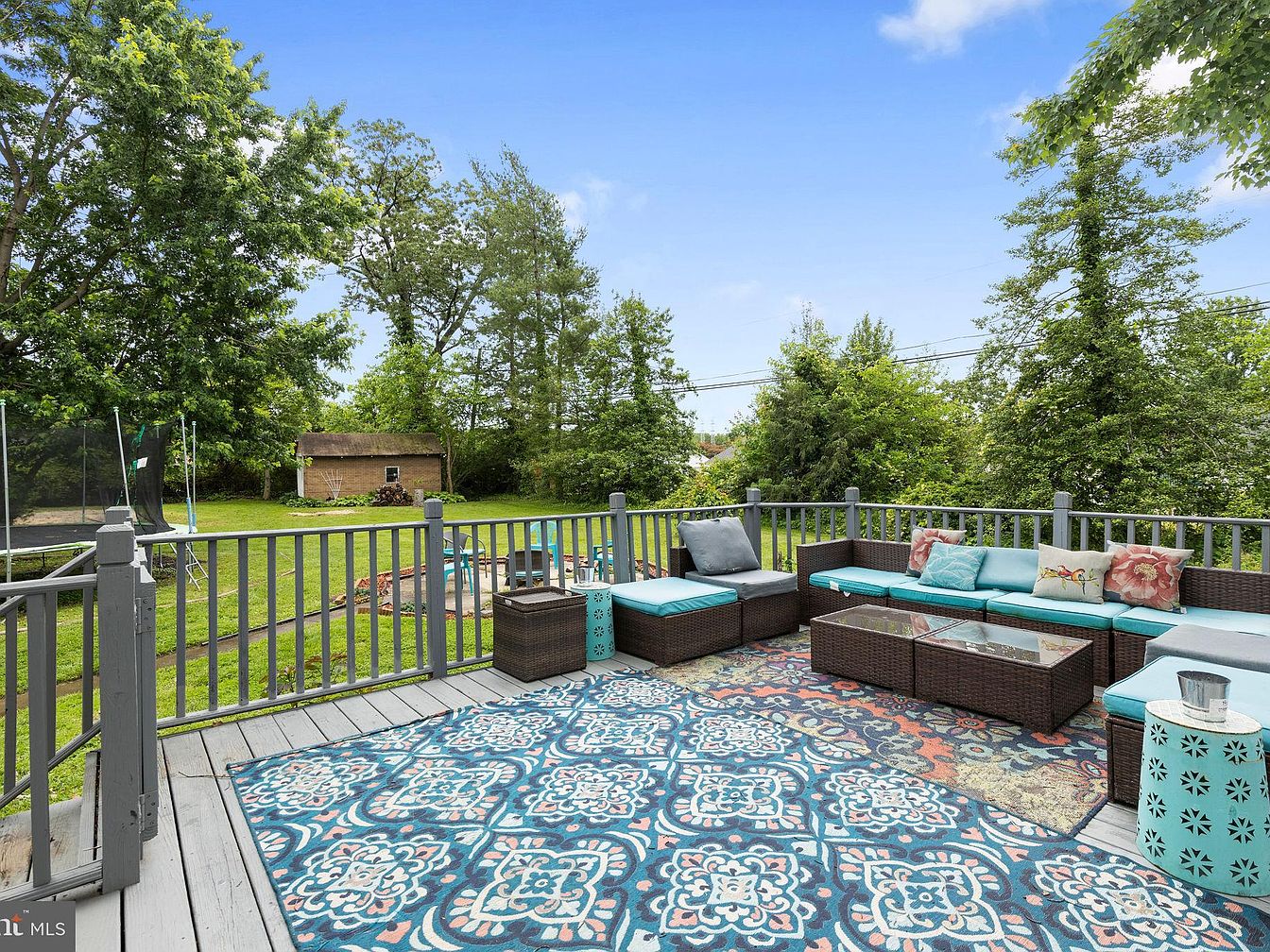 This spacious backyard deck extends from the home, framed by sturdy gray railings that enhance safety without obstructing the view. The floor features wide wooden planks painted in a muted gray, complementing the vibrant and intricately patterned outdoor rug that anchors the seating area. A modern sectional sofa set in woven dark wicker is accented with bright turquoise cushions and floral throw pillows, adding cheerful pops of color. A glass-top coffee table and decorative turquoise side tables offer functional surfaces. Beyond the deck lies a large, lush lawn bordered by mature trees and a small rustic shed, creating a peaceful outdoor retreat.
