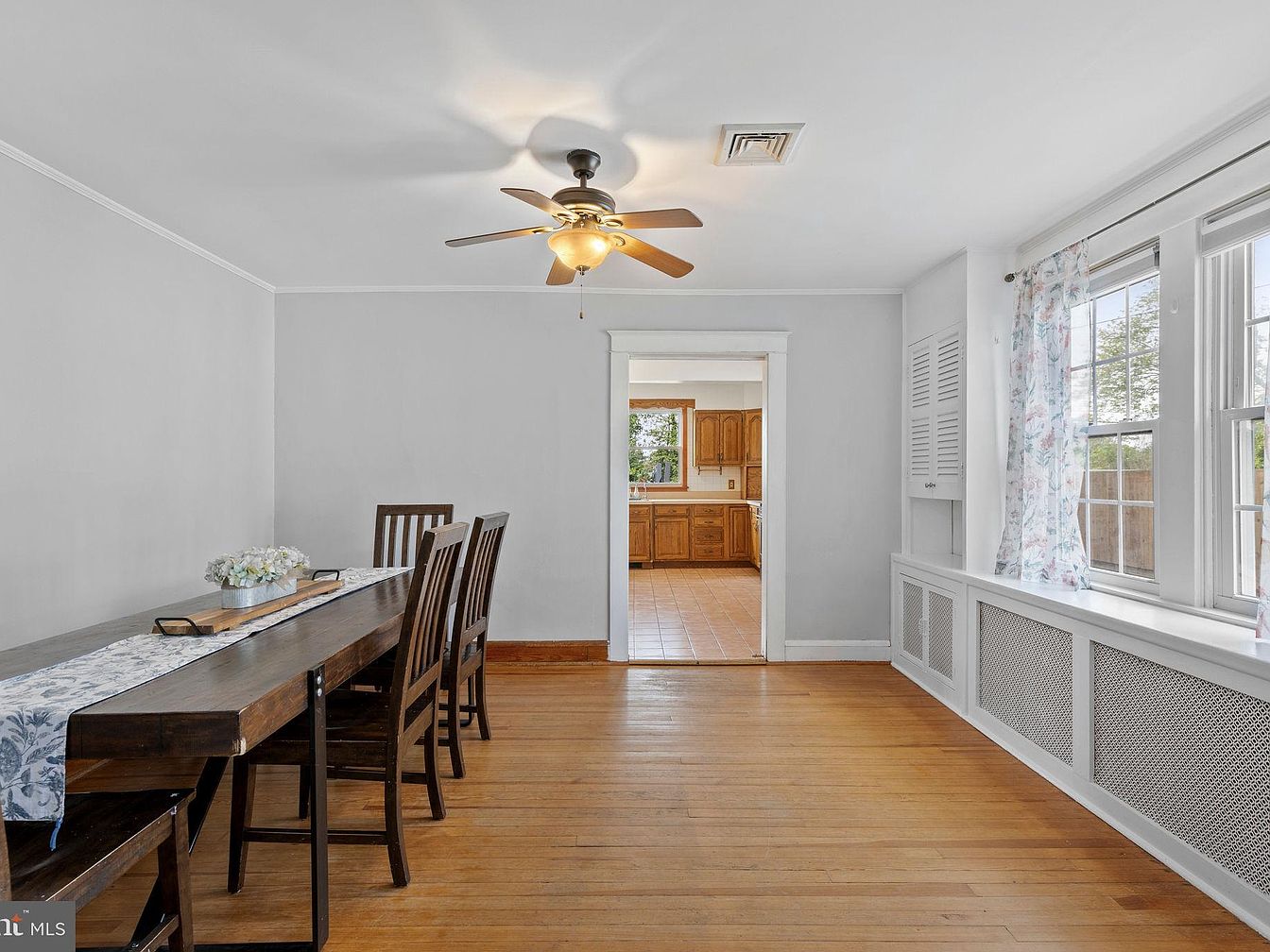 This dining room features a clean, bright design with light gray walls complemented by natural wood floors, creating a warm yet contemporary atmosphere. A long, dark wood dining table with matching chairs provides ample seating, enhanced by a floral table runner and a centerpiece of white flowers. Large windows along one wall, dressed with light, floral-patterned curtains, flood the space with natural light while offering views to the outdoors. The ceiling fan with wooden blades adds functional comfort. White built-in cabinetry and radiator covers add charm and storage, while an open doorway leads to a kitchen with classic wood cabinetry.