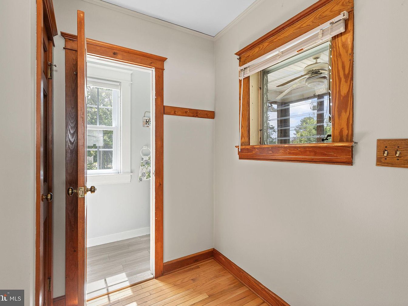 This cozy nook likely serves as a transition space near the home’s entrance, distinguished by warm wooden trim framing a window and door. The natural wood tones create an inviting contrast against the soft beige walls and light-toned hardwood flooring. The window opens to an exterior covered porch area, visible through the glass with a ceiling fan beyond, suggesting an airy connection to outdoor living. A simple wooden coat hook rail runs along the wall, adding a functional touch. The mix of natural light and wood details gives this space a charming, rustic feel while maintaining simplicity and practicality.