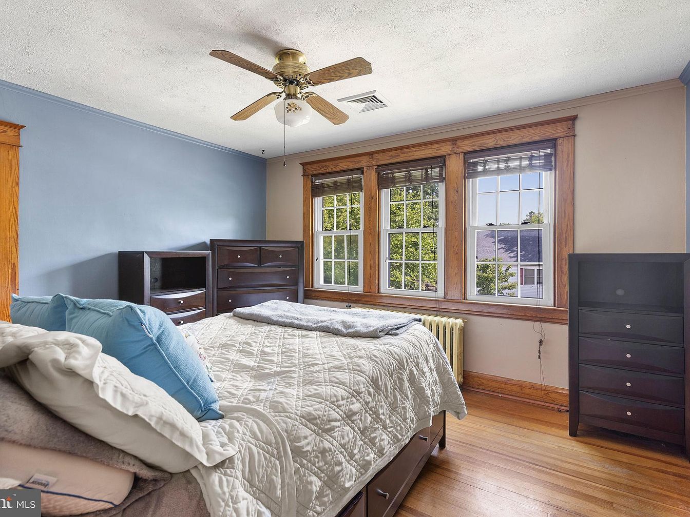 This master bedroom features a clean, serene aesthetic with an emphasis on natural light through three large, grid-style windows framed in warm wood trim. The room employs a calming color palette, combining a soft blue accent wall with neutral beige tones on the remaining walls, enhancing relaxation. The wooden floor complements the trim and provides a cohesive warmth to the space. Dark wood furniture pieces, including a dresser, nightstand, and chest of drawers, contrast elegantly with the light bedding, quilted in a subtle pattern. A ceiling fan with wooden blades and a vintage-style light fixture adds functionality and charm to this cozy retreat.