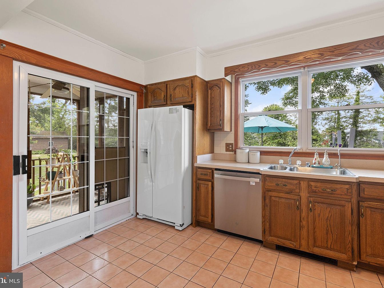 This bright kitchen area features a warm, inviting aesthetic with oak cabinetry that adds a classic charm to the space. The cabinets extend above and below the cream-colored countertops, providing ample storage and workspace. A double stainless steel sink sits beneath a large window framed in coordinating wood trim, offering a scenic view of the backyard, highlighted by a blue patio umbrella and mature trees. To the left, a white side-by-side refrigerator blends seamlessly with the cabinetry. Sliding glass doors with white panes provide direct access to an outdoor patio, connecting indoor and outdoor living spaces effortlessly. The floor is tiled in a soft peach tone, complementing the natural wood and creating a cozy, homey feel.