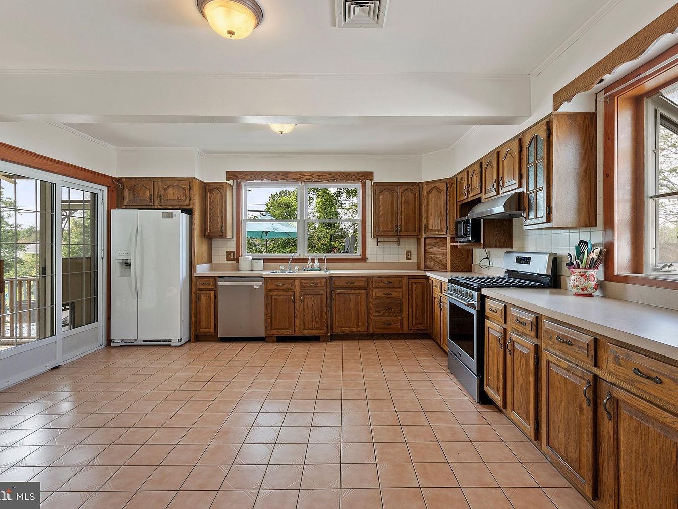 This generously sized kitchen features a warm, traditional design with extensive wood cabinetry that lines three walls, offering ample storage and a sense of classic charm. The countertops are light-colored, creating a soft contrast to the rich wood tones of the cabinets. Large windows above the sink and to the right allow natural light to fill the space, highlighting the earthy terracotta floor tiles that add a rustic texture to the room. Modern appliances, including a refrigerator, dishwasher, and stainless steel stove, blend seamlessly with the traditional aesthetic. Sliding glass doors open to an outdoor area, enhancing openness and connectivity.