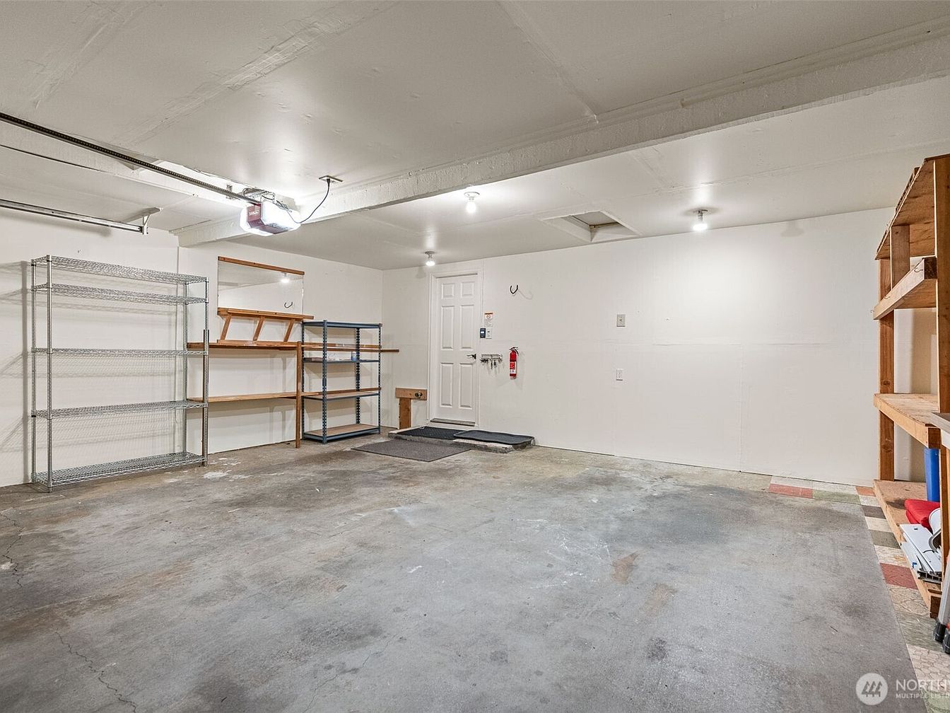 This spacious garage area is designed with functionality in mind, featuring a concrete floor that shows signs of typical use and wear. White walls and ceiling ensure the space feels bright despite its utilitarian purpose, aided by multiple ceiling-mounted bulbs. Storage is provided by a combination of metal and wooden shelving units along the walls, offering ample options for organizing tools, equipment, or seasonal items. A white interior door leads out from the garage, with mats in front for cleanliness. The overall aesthetic is practical and clean, emphasizing storage and organization without decorative distractions.