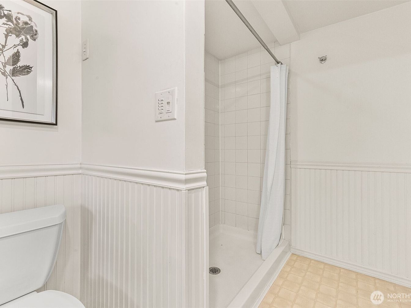 This bathroom features a compact yet functional shower nook with classic white square tiles lining the interior. The shower is enclosed by a simple white curtain suspended from a curved rod, enhancing ease of access. The walls are painted white, complemented by beadboard wainscoting running midway around the room, introducing texture and subtle visual interest. A white toilet is positioned nearby, blending seamlessly with the neutral color palette. The floor is covered with a beige vinyl or linoleum patterned to mimic tiles, adding warmth to the otherwise cool, clean space. An elegant framed floral artwork adds a soft decorative touch to the atmosphere.