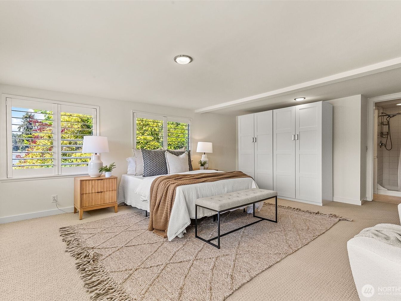 This master bedroom offers a serene and bright atmosphere with large windows featuring white plantation shutters, allowing natural light to flow through and providing lush garden views. The room is decorated in soft, neutral tones dominated by beige carpet flooring and a large patterned area rug that anchors the space. The bed is dressed in crisp white linens accented by textured pillows and a cozy brown throw blanket. On either side of the bed, natural wood nightstands hold matching white lamps, adding warm ambient lighting. A sleek, black metal-framed bench with a cushioned top sits at the foot of the bed, while a set of tall, white wardrobes provides ample storage. The room also includes a visible doorway leading to an adjoining bathroom, enhancing functionality and comfort.