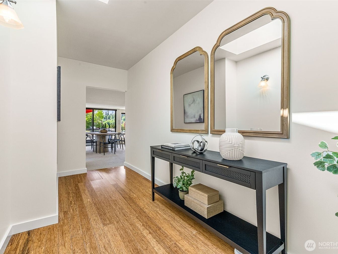 This entry hallway features a clean and inviting layout with warm wooden flooring that adds an organic touch to the crisp white walls. A sleek black console table with three drawers and a lower shelf sits along the right wall, adorned with minimalist decor including a large white textured vase, a silver abstract sculpture, and a small green plant. Two large matching mirrors with elegantly curved gold frames hang above the console, enhancing the sense of space and reflecting natural light. The end of the hallway opens up to a bright living area, visible with outdoor views.