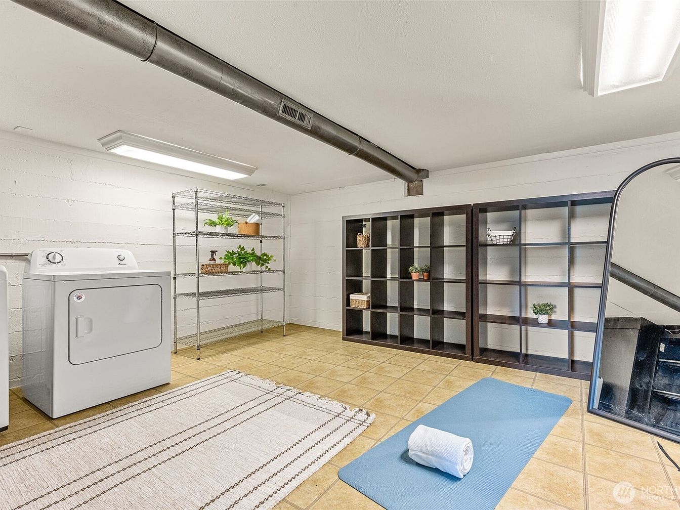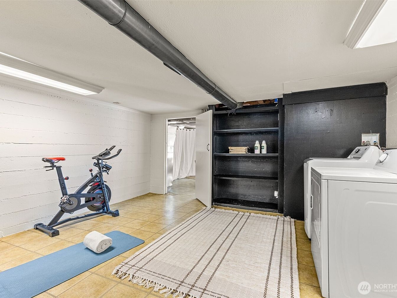 This basement area combines functionality and fitness in one streamlined space. The walls are painted white with a textured finish, contrasting a striking black built-in shelving unit that adds depth and storage options. The floor is covered with warm-toned square tiles that create an inviting foundation. On one side, a compact laundry setup features a white washer and dryer, emphasizing practicality. Parallel to the appliances is a workout zone equipped with a stationary bike and a rolled towel placed atop a blue exercise mat, suggesting readiness for exercise. A large woven rug lies centrally, softening the space’s industrial touches. Overhead fluorescent lighting brightens the entire room, while an exposed black duct runs along the ceiling, hinting at the basement’s raw architectural style.