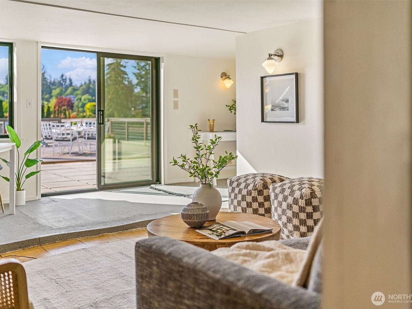 This cozy living area features a modern yet inviting design with a soft, neutral color palette dominated by shades of beige, white, and natural wood tones. A round wooden coffee table anchors the space, adorned with simple accent pieces, including a vase with fresh greenery. Two patterned ottomans offer additional seating, complementing the textured gray sofa subtly seen in the foreground. The room is well-lit by natural light streaming through large sliding glass doors that open onto a spacious deck with outdoor furniture, blending indoor and outdoor living. Minimalist wall sconces and a black-and-white photo add understated charm to the white walls.