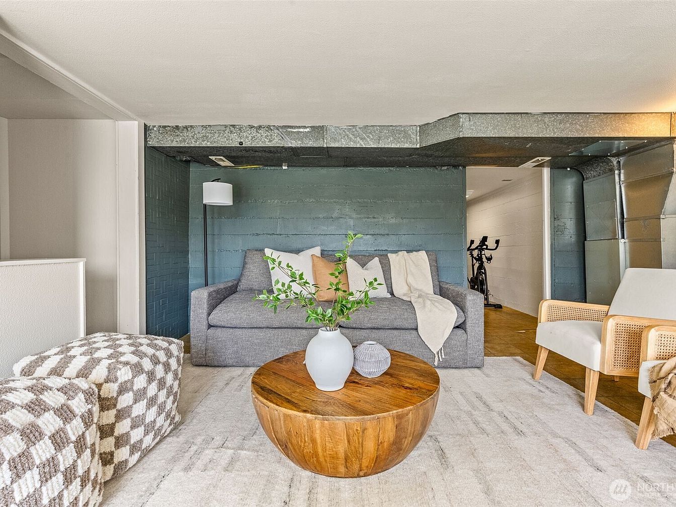 This cozy basement sitting area features a muted color palette with cool blues and neutral grays that create a calming atmosphere. A modern gray sofa with assorted soft pillows and a light throw is positioned against a textured blue-green concrete wall, accented by a sleek black floor lamp. The wooden coffee table has a rich, natural finish, topped with simple decorative vases and greenery, adding warmth and an organic touch. Plush checkered ottomans on one side and an armchair with cane arms and cream upholstery offer varied seating options on a light, textured area rug. Exposed ductwork overhead adds an industrial element, blending functionality with inviting design.