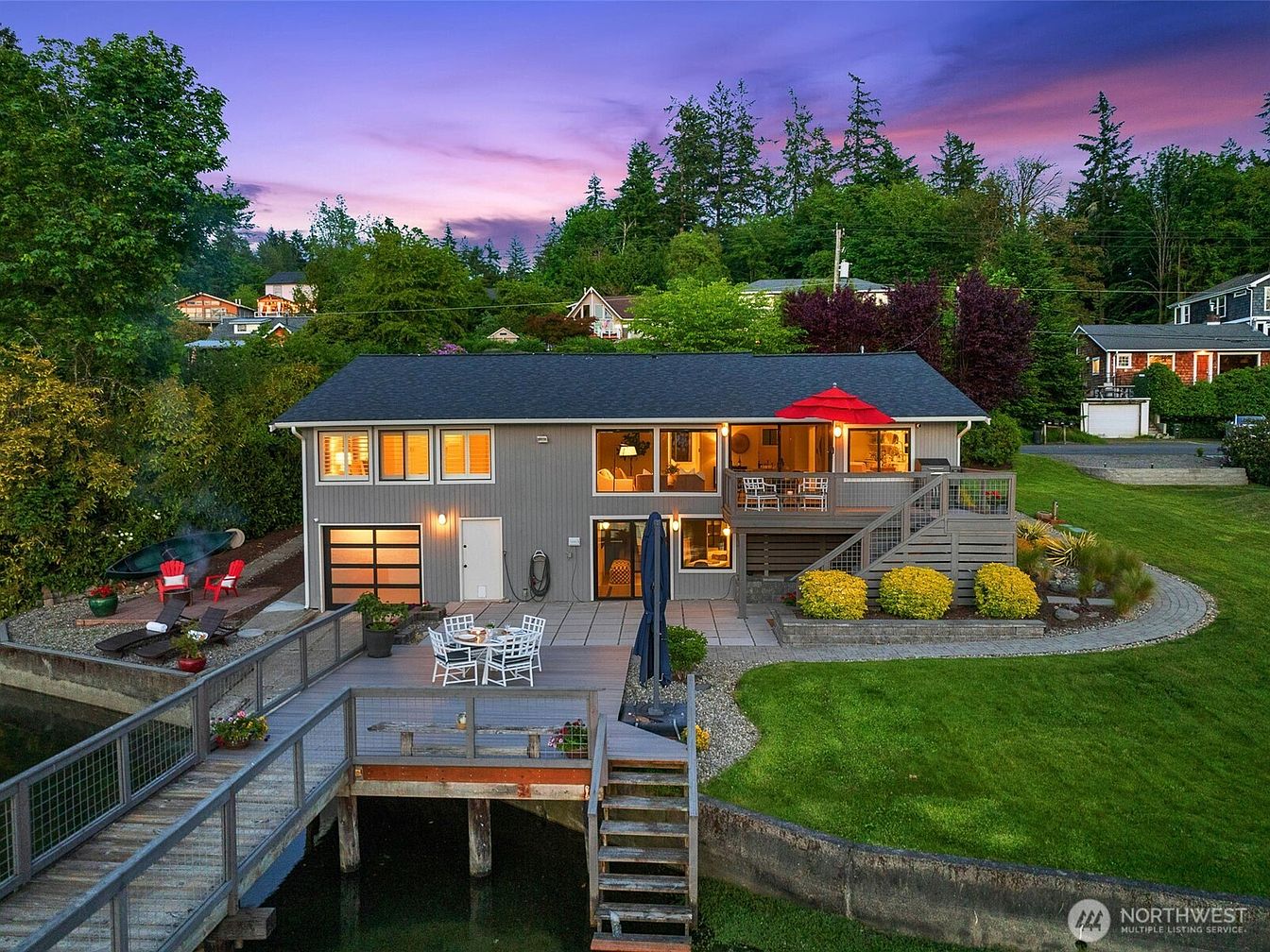 This serene outdoor space features a multi-level deck and patio extending over the water, creating a perfect spot for relaxation and entertainment. The main deck area holds a round dining table with white chairs, complemented by a bright red umbrella providing vibrant contrast to the soft grey exterior of the house. A set of steps leads down to a wooden dock, ideal for waterside leisure. The adjacent patio offers additional seating with form-fitting chairs arranged around a fire pit. The lush green lawn and surrounding trees enhance the peaceful, nature-infused ambiance, making this an inviting waterfront retreat.
