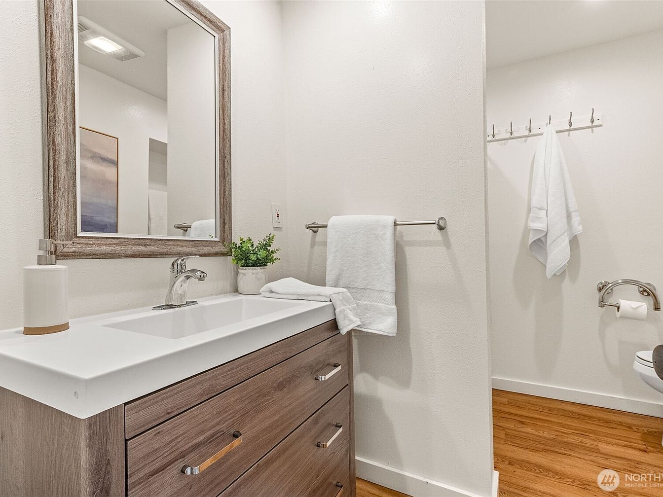 This bathroom features a modern yet warm design centered around a wooden vanity with a white countertop and an inset sink. Above the vanity hangs a large rectangular mirror framed in a weathered wood finish, complementing the vanity’s natural tones. The walls are painted a clean, crisp white which brightens the space and contrasts nicely with the medium-toned hardwood flooring. Functional accents include a chrome faucet, a wall-mounted towel bar with neatly folded white towels, and a row of hooks on the adjacent wall for hanging additional towels or robes. The layout is practical and streamlined, balancing simplicity with subtle rustic charm.