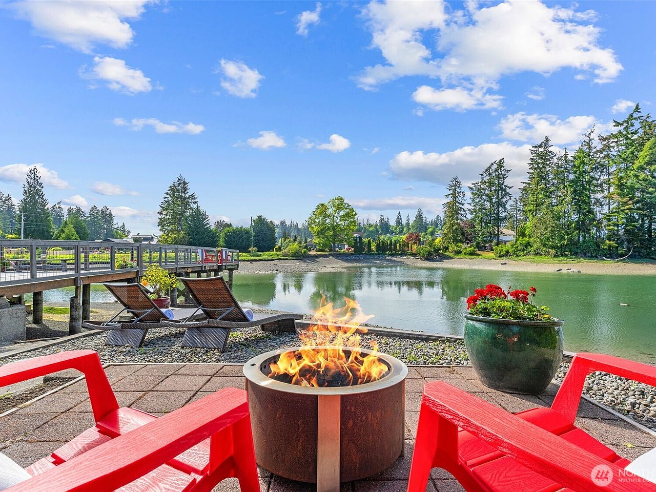 This inviting outdoor patio area is designed for relaxation and social gatherings, featuring a central round firepit that offers warmth and ambiance. Bright red Adirondack-style chairs surround the firepit, adding a vibrant splash of color that contrasts beautifully with the natural greens and blues of the surrounding landscape. Beyond the paved patio, two woven lounge chairs sit on a gravel bed, oriented toward calm waters edged by mature trees, enhancing the sense of tranquility. A large green planter with red flowers introduces a touch of nature close by, blending comfort with picturesque waterfront views under a clear blue sky.
