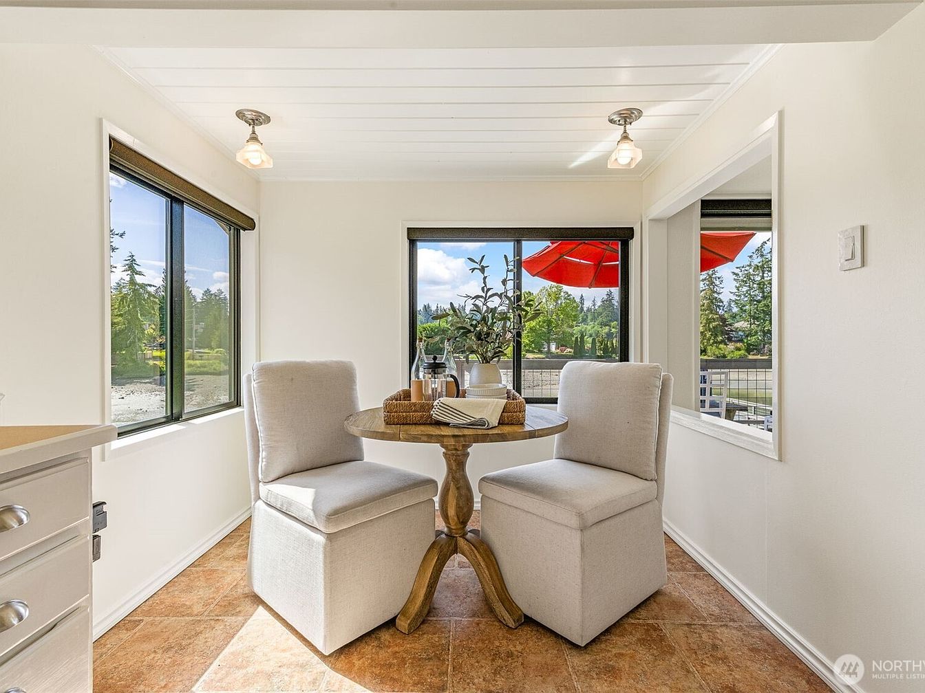 This cozy breakfast nook features a compact round wooden table surrounded by two comfortable, cushioned chairs upholstered in light beige fabric. The walls are painted a soft white, complementing the warm terracotta-colored tile flooring. Large windows on two sides flood the space with natural light and provide serene views of lush greenery and a vibrant red outdoor umbrella, adding a pop of color. The white paneled ceiling has simple, vintage-style light fixtures that add charm. Overall, the area creates an inviting atmosphere perfect for casual dining or morning coffee with a scenic backdrop.