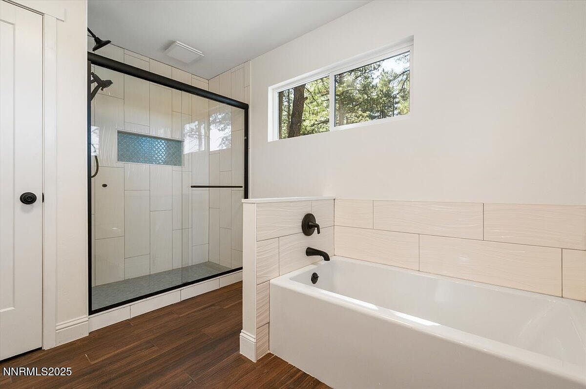 This bathroom features a contemporary design combining neutral tones and natural elements. The spacious walk-in shower is framed by matte black metal and white vertically laid rectangular tiles, accented by a textured blue glass niche. Adjacent to the shower is a modern white bathtub with sleek black fixtures, surrounded by horizontally placed off-white tiles that add subtle texture. The flooring mimics warm wood, creating a cozy contrast against the light walls. A wide horizontal window lets in natural light while maintaining privacy, enhancing the room’s airy and calming ambiance.