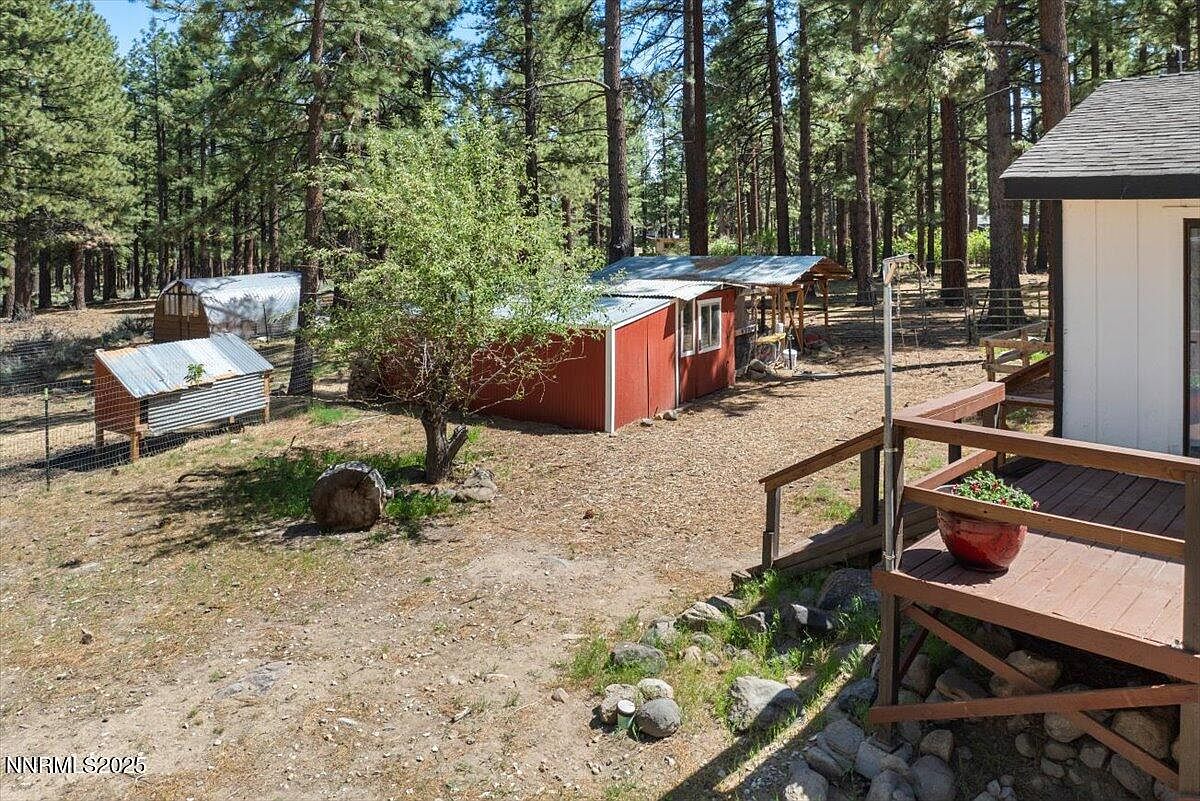 This serene backyard features a natural earthy setting surrounded by tall pine trees, contributing to a peaceful woodland atmosphere. Central to the scene is a vibrant red outbuilding with white-trimmed windows and a metal pitched roof, complemented by smaller sheds with similar roofing styles. The yard itself has a slightly rugged ground of dirt and sparse grass, with scattered rocks and a tree stump adding to the rustic charm. A wooden deck with natural brown stain extends from the house, housing a bright red planter that injects a pop of color. This area blends functional storage with a nature-inspired aesthetic.