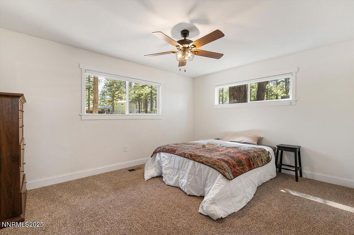This modest bedroom features a cozy, neutral color scheme dominated by white walls and beige carpeting that adds warmth to the space. Two horizontally oriented windows bring in natural light and provide views of the wooded outdoors, enhancing a sense of tranquility. The bed sits low against the wall with a white comforter topped by a patterned, earthy-toned throw blanket. A dark wood chest of drawers and a simple black stool serve as the only furnishings, underscoring a minimalist aesthetic. A ceiling fan with wooden blades and a cage light fixture centers the ceiling, adding functional charm to the room’s understated simplicity.