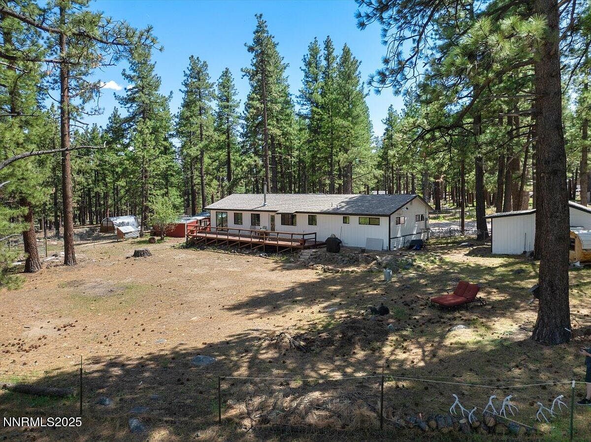 This spacious backyard is embraced by tall pine trees, providing a serene and private forest-like setting. The long, single-story house features white siding with a dark roof, complemented by a wooden deck spanning much of the length of the home’s rear. The deck railing appears sturdy and fits naturally within the outdoorsy aesthetic. To the right, a small white shed or secondary structure adds functional storage space. The ground is mostly bare with scattered pine needles and natural underbrush, enhancing the rugged, natural ambiance. Outdoor seating, including a red lounge chair, invites relaxation in this peaceful, rustic retreat.