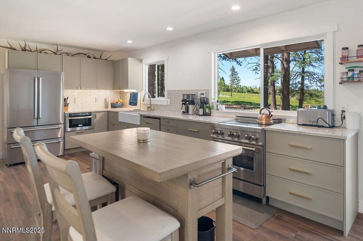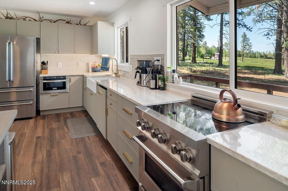 This kitchen features a sleek and contemporary design with a neutral palette dominated by soft gray cabinetry and crisp white marble countertops. Brass hardware adds a warm, elegant touch to the cabinetry. The space is lined with wood-look flooring that brings in natural warmth and texture. A large stainless-steel refrigerator sits at one end, while a built-in microwave is seamlessly integrated into the cabinetry. The stove, equipped with modern knobs and a reflective surface, sits below a wide window offering expansive views of lush greenery outside, flooding the kitchen with natural light. Clean white subway tile backsplash elevates the space, complementing minimalistic faucets and a practical sink area. Overall, the kitchen balances functionality with understated sophistication, creating a welcoming culinary hub with a scenic outdoor connection.