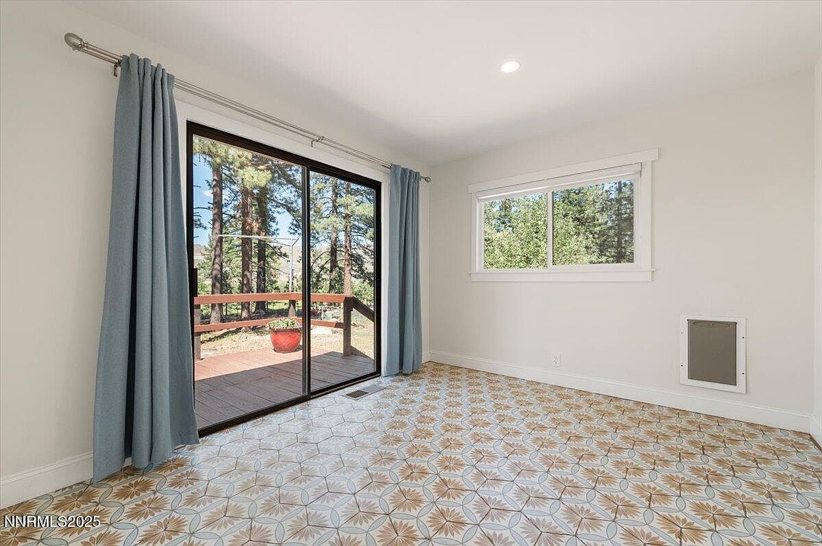 This bright sunroom features a unique patterned tile floor in earthy tones of beige, brown, and blue, adding character to the room. Walls are painted a soft white, enhancing the natural light pouring in through the large sliding glass door and adjacent window. The sliding door opens to a wooden deck with a railing, blending indoor and outdoor living. Light blue curtains frame the door, complementing the tile colors and adding a touch of softness. The room feels airy and inviting, perfect for relaxing while enjoying views of the surrounding pine trees.