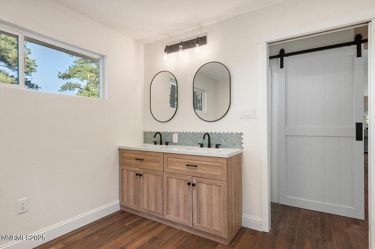 This bathroom features a dual-sink vanity with a natural wood finish, topped with a clean white countertop that enhances the room’s bright, airy feel. Above the sinks, two oval mirrors with slim black frames add a modern touch, complementing the matching black faucets. The backsplash consists of uniquely scalloped tiles in a muted green that inject subtle color and texture without overwhelming the space. A horizontal window near the ceiling invites natural light while maintaining privacy. The flooring is a warm, rich wood tone that contrasts softly with the white walls and the sleek sliding barn door leading to another room.