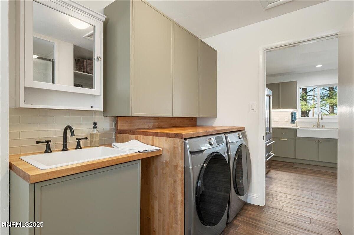 This compact laundry room features a clean, functional layout with modern design elements. A pair of sleek, front-loading stainless steel washers and dryers sit beneath a butcher block countertop, which continues seamlessly onto the folded side and extends beneath matte olive cabinetry. The white rectangular farmhouse-style sink with matte black fixtures contrasts subtly against the light beige subway tile backsplash. Above the sink, a mirrored medicine cabinet adds practical storage while reflecting light to enhance the space’s brightness. Natural wood-look tile flooring extends from this room to the adjacent kitchen, visible through the open doorway, creating cohesive flow.