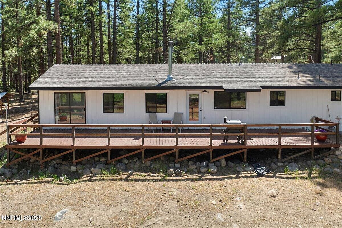 This spacious back deck extends the length of the home, featuring natural wood tones that complement the rustic forest setting. The deck is bordered by a simple wooden railing and raised on sturdy supports over a rocky foundation, offering a perfect outdoor area for relaxation or entertaining. A couple of chairs and a small table create an inviting seating nook near the center door, while a barbecue grill on one side suggests readiness for outdoor cooking. The exterior of the house is painted a clean white with dark-framed windows, creating a classic, understated look. Tall pine trees surround the home, enhancing the natural, peaceful atmosphere of this outdoor space.