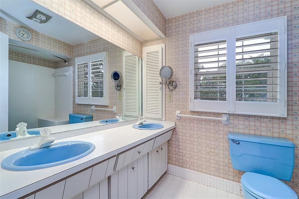 This bathroom features a long white countertop with dual blue sinks, creating a charming contrast. Beneath the counter, white cabinetry with small metal knobs offers ample storage. The walls are covered with a soft beige and light pink checkered wallpaper, adding a vintage feel. A large mirror extends across the vanity, enhancing light and space, complemented by a rectangular overhead light panel. White plantation shutters on the window provide privacy while letting in natural light. The blue toilet and seat echo the sink color, tying the room together with a cohesive retro aesthetic. White tiled flooring completes the look.