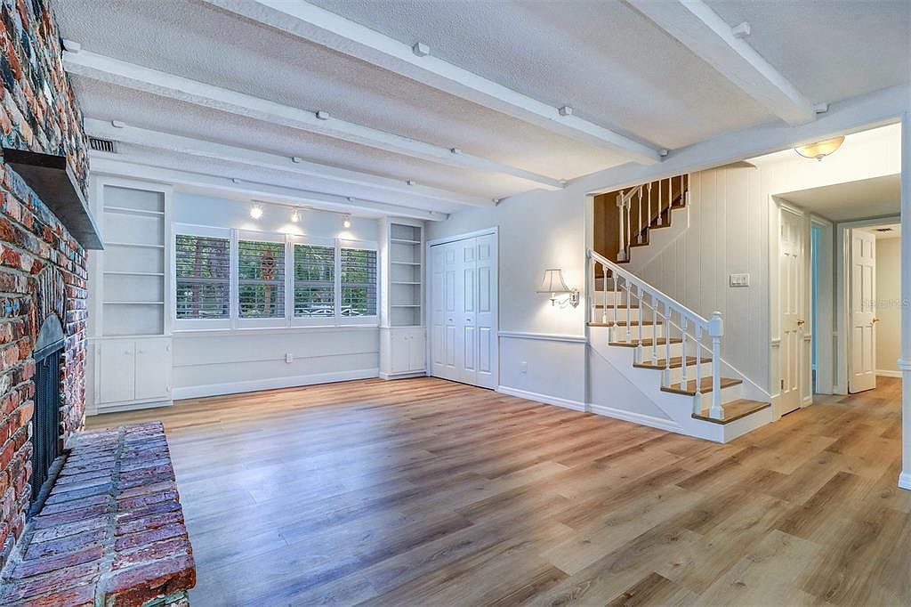 This spacious living room features a charming blend of rustic and modern design elements. A striking exposed brick fireplace creates a warm focal point on one side, contrasting with the smooth white walls and ceiling beams that add architectural interest. Natural light floods in through large windows framed by built-in white shelving units that offer both display and storage options. The light wood flooring complements the overall neutral color palette, while a wall-mounted sconce beside the staircase enhances the inviting ambiance. The adjacent staircase with white railings and wood treads subtly connects the space to the rest of the home.