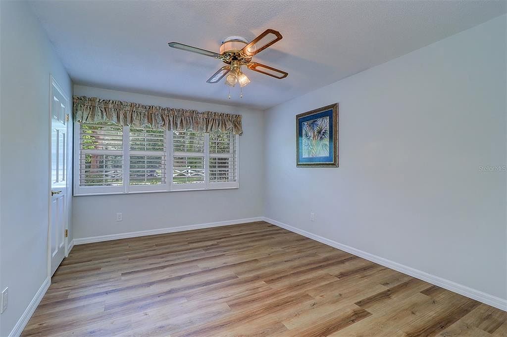 This bright bedroom corner is defined by soft, neutral walls painted in light grey, creating a calm and inviting atmosphere. Two windows with white plantation shutters allow natural light to filter in while providing privacy, and frame views of lush greenery outside. The warm oak wood-look laminate flooring adds a natural texture and warmth to the space. A classic ceiling fan with brass and wood accents offers both lighting and airflow, complementing the understated design. Baseboards and clean lines contribute to a fresh, updated aesthetic perfect for a restful retreat.