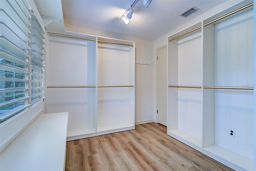 This spacious walk-in closet features a clean, minimalist design with white built-in shelving and double hanging rods that maximize clothing storage. The room is illuminated by soft overhead lighting accompanied by natural light filtering through wide white plantation shutters on a large window, enhancing the airy feel. The floor is covered with warm, wood-tone laminate flooring that adds a cozy contrast to the white walls and closet units. A small white bench under the window provides a convenient seating or storage spot, while the simple beige walls and subtle molding keep the space modern yet understated.