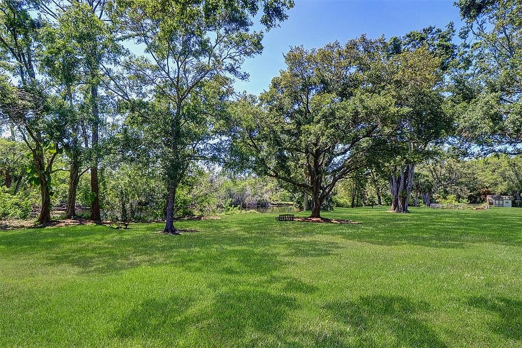 This expansive backyard features a lush, well-maintained green lawn surrounded by mature trees that provide ample shade and privacy. The open grassy area is ideal for outdoor activities or quiet relaxation, with a clear view of the serene landscape extending towards a water feature in the distance. The combination of vibrant green grass and natural tree canopy creates a peaceful, inviting atmosphere. The space blends natural and landscaped elements harmoniously, perfect for family gatherings, play, or simply enjoying the outdoors in a tranquil suburban setting.
