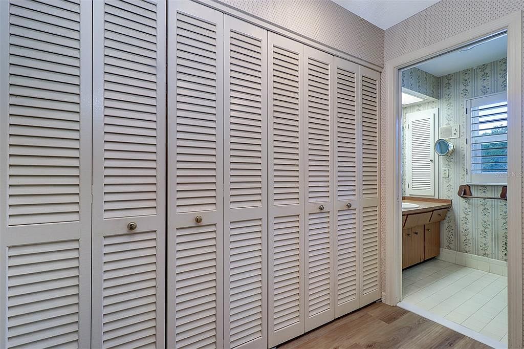 This area features a long row of louvered closet doors painted in a soft beige, enhancing ventilation and texture. The closet fronts dominate one wall, offering ample storage space. The floor transitions from warm-toned hardwood in the hallway to light-colored tiles in the adjacent bathroom. The bathroom entry reveals vintage floral wallpaper with a muted color palette, complemented by a wooden vanity in a natural finish. A small round magnifying mirror and shuttered window add functional charm, while the overall design leans toward classic and cozy aesthetics.