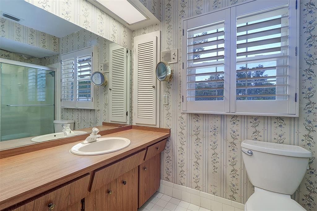 This bathroom space features a long wooden vanity with a single white sink embedded in a smooth countertop, complemented by ample cabinetry below for storage. The walls are adorned with vintage-style floral patterned wallpaper in muted beige and blue tones, adding a touch of charm and softness to the room. A large mirror spans the length of the vanity, creating a sense of spaciousness. White plantation shutters cover a window, allowing natural light to filter in while maintaining privacy. The toilet is tucked neatly beside the vanity. The overall design evokes a cozy and classic ambiance with functional elements.