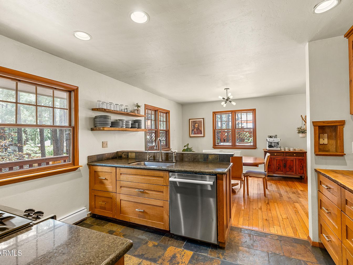 This open kitchen features warm wooden cabinetry with sleek stainless steel appliances, highlighted by a built-in dishwasher and granite countertops. The slate tile flooring contrasts beautifully with the natural wood trim around the windows and cabinetry, adding rustic charm. Open wooden shelves display dishware, enhancing the casual, accessible feel. Bright natural light filters through multiple wood-framed windows, creating an inviting atmosphere. Adjacent is a cozy breakfast nook with a round wooden table surrounded by light-colored chairs, complemented by a classic red sideboard and modern light fixture overhead, bridging traditional and contemporary styles effortlessly.