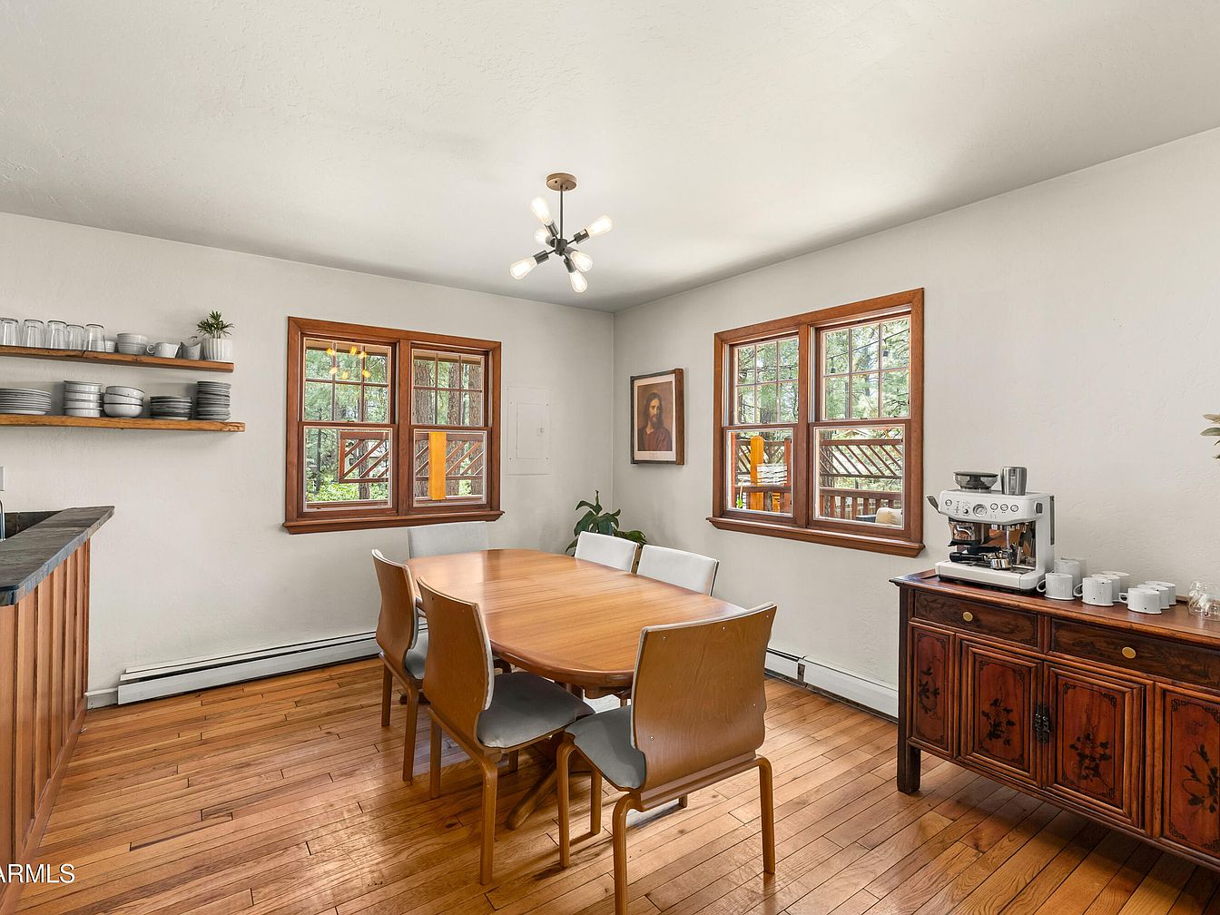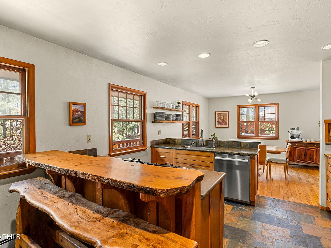 This kitchen features a warm rustic design with natural wood cabinetry and trim complementing the neutral walls. The countertops include a dark stone surface that contrasts with the softer wooden elements, while the natural, live-edge wood bar adds organic character. Open shelving displays neatly stacked dishes and glassware, enhancing the welcoming atmosphere. The floor transitions from multicolored slate tiles near the kitchen to warm hardwood in the adjoining breakfast nook, where a modest dining table and simple chairs sit beneath a modern light fixture. Large windows flood the space with natural light, emphasizing the connection to the outdoor scenery.