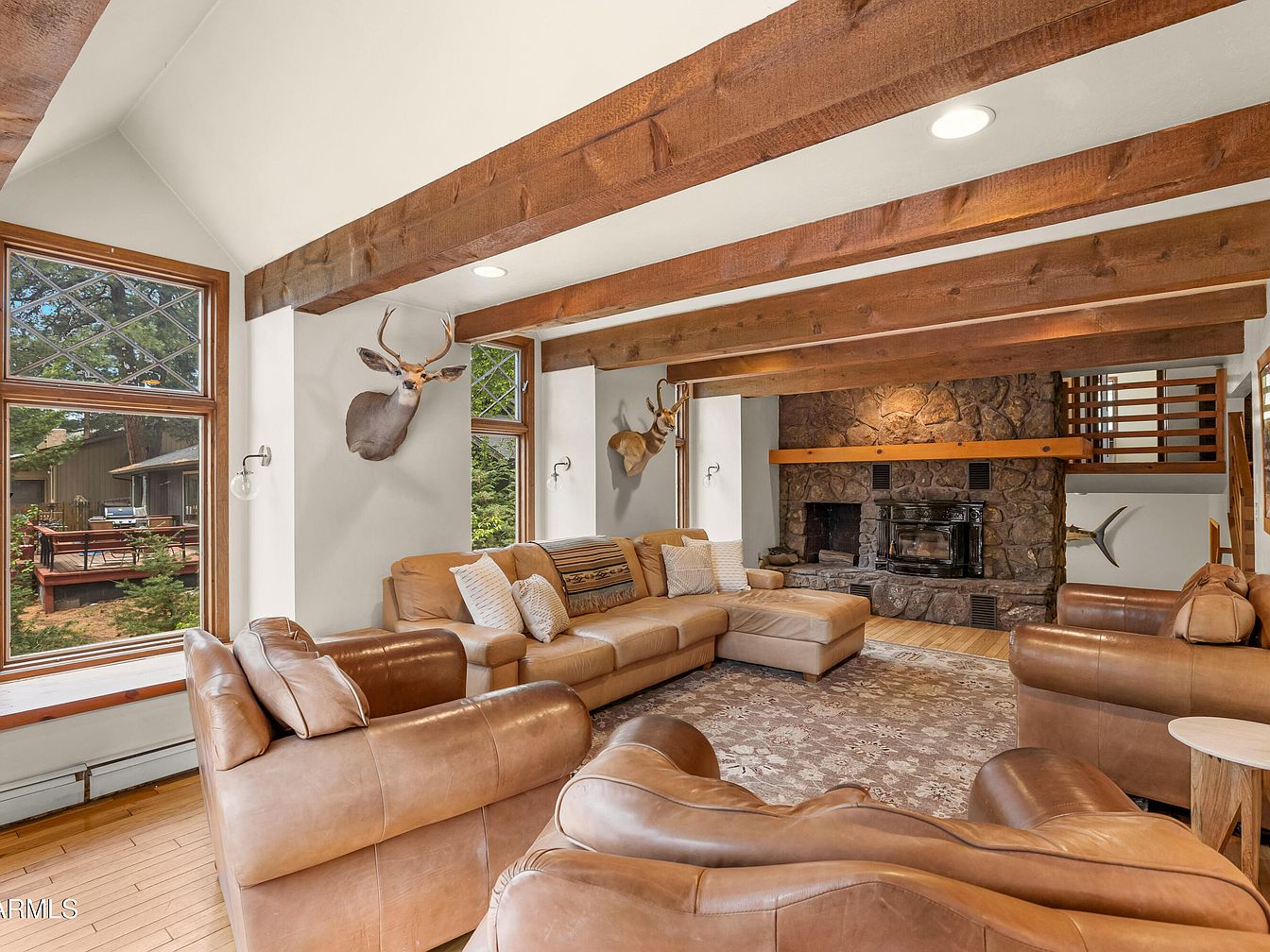 This inviting living room features robust wooden ceiling beams that add warmth and a rustic charm. A large sectional leather sofa in natural tan tones provides ample seating, surrounded by matching leather armchairs, creating a comfortable and cohesive setting. The stone fireplace with a wooden mantle serves as a focal point, enhancing the cozy ambiance. White walls decorated with mounted antelope and deer heads add a traditional, lodge-inspired aesthetic. Large windows framed in rich wood allow natural light and views of greenery outside, while a patterned area rug grounds the seating area with subtle color and texture.