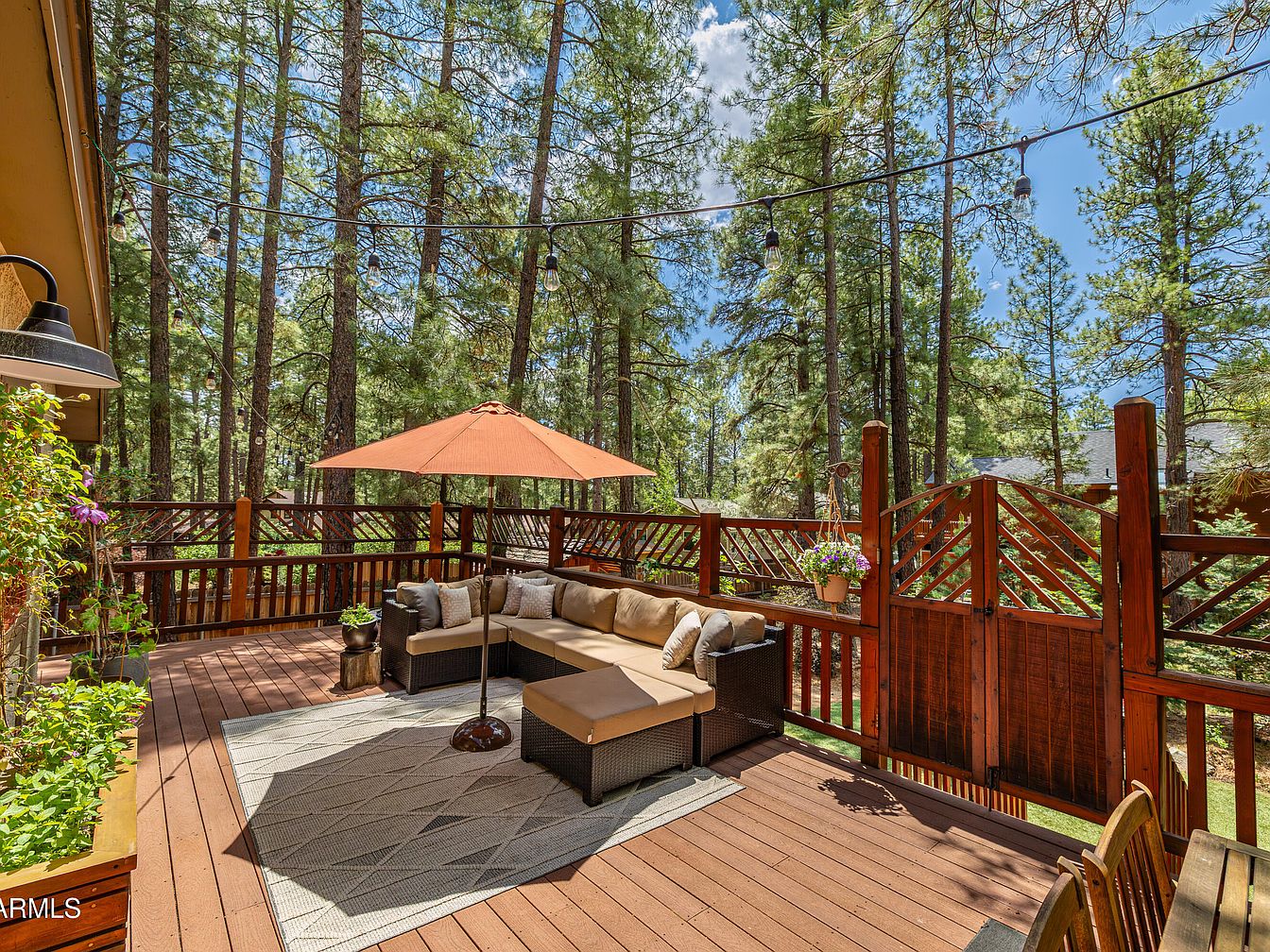 This inviting outdoor deck features a spacious wooden floor with warm tones complementing the natural forest surroundings. A large L-shaped wicker sectional sofa with beige cushions and assorted throw pillows anchors the seating area, resting on a light geometric outdoor rug. An orange patio umbrella provides shade while string lights overhead create a cozy ambiance for evening gatherings. The deck’s wooden railing includes detailed latticework, which adds charm and allows views of the lush greenery beyond. Nearby, a wooden dining table with chairs and potted plants along the perimeter enhance the relaxed and welcoming atmosphere of this outdoor living space.