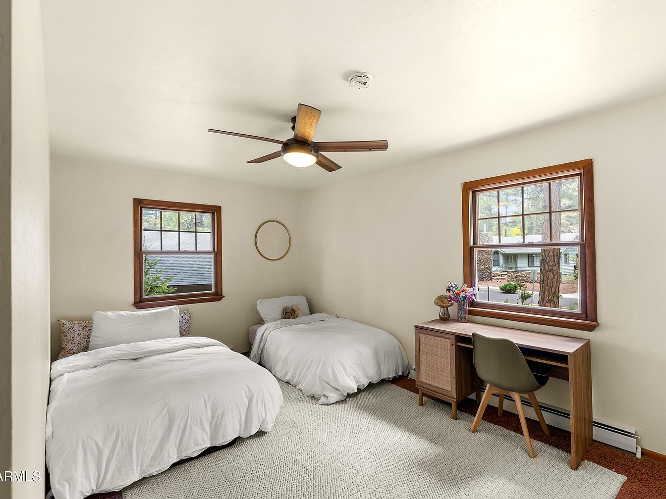 This serene bedroom features a pair of twin beds dressed in crisp white bedding, positioned side by side against a soft cream-colored wall. Natural light pours in through two wooden-framed windows, offering views of the outdoors and enhancing the room’s airy atmosphere. A sleek wooden desk with cane detailing sits neatly beneath one window, paired with a minimalist chair, perfect for study or work. The ceiling fan with wooden blades adds warmth and comfort while complementing the natural wood trim. A round minimalist mirror on the wall adds subtle decorative interest without overwhelming the calming, uncluttered space.