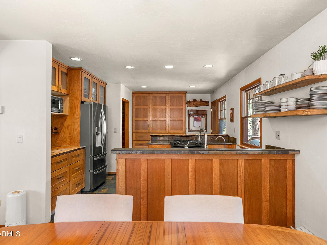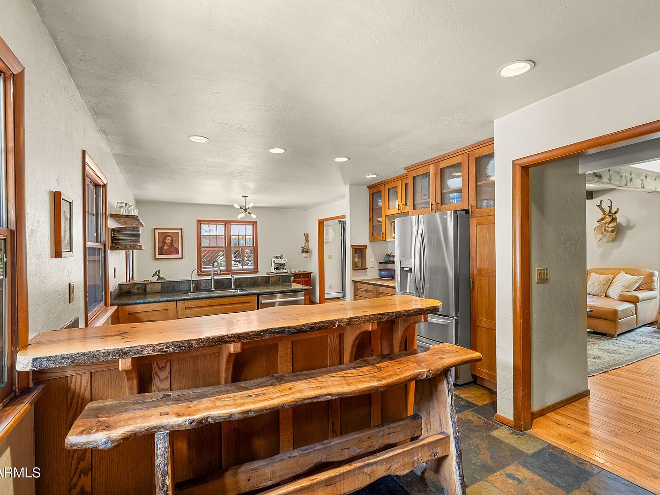 This kitchen features a warm, inviting rustic aesthetic highlighted by rich wooden cabinetry and a live-edge wooden bar with matching bench seating. The countertops and backsplash are dark stone, contrasting beautifully with the natural wood tones. Stainless steel appliances, including a large refrigerator, add a modern touch to the space. Natural light pours in through multiple wood-framed windows, enhancing the earthy palette. The slate-patterned floor tiles complement the overall rustic charm while the white ceiling with recessed lighting keeps the space bright and open. An open doorway leads to a cozy living area, visible in the background.