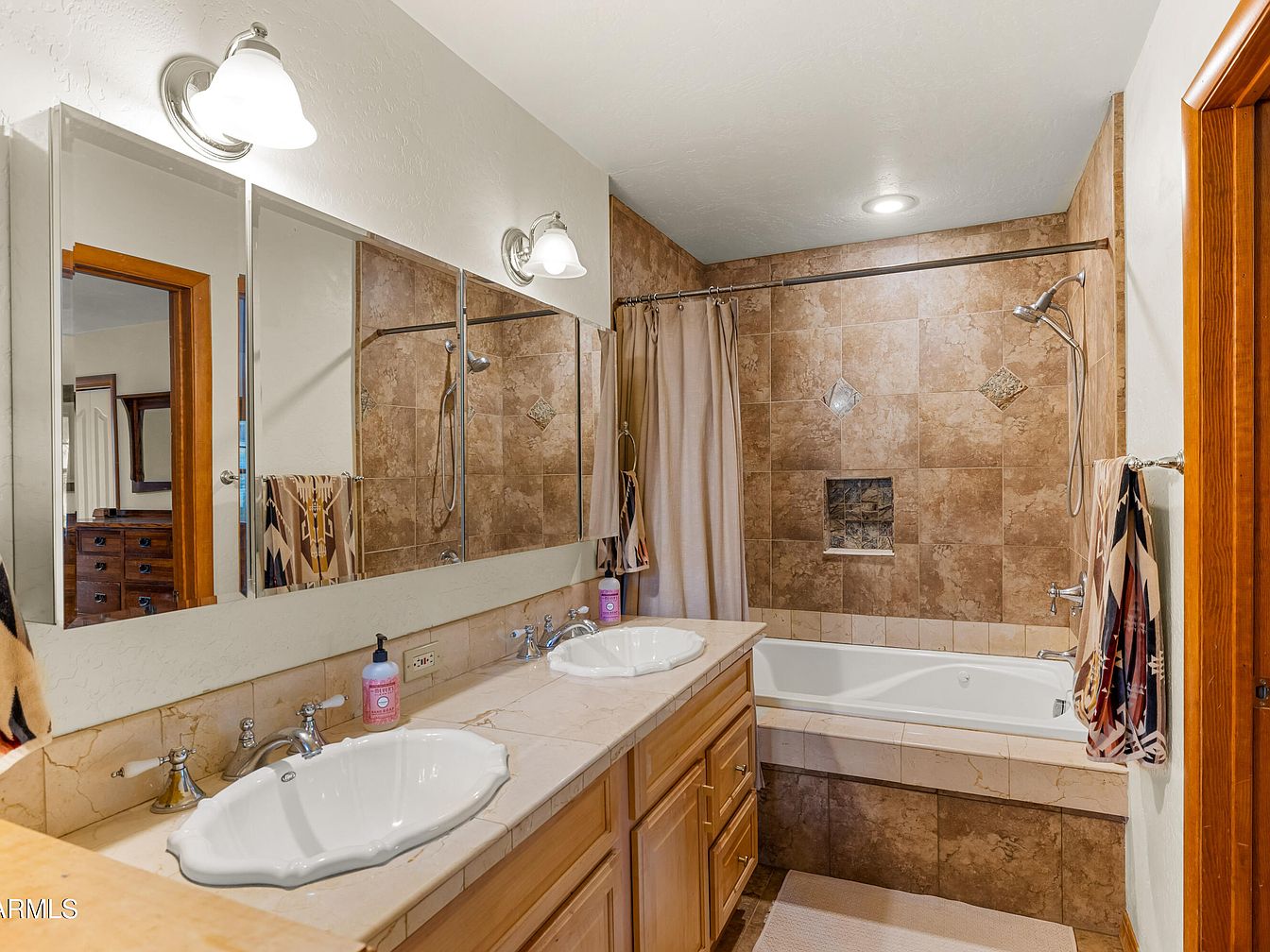 This bathroom features a warm, inviting aesthetic highlighted by beige and tan stone tiles that surround the bathtub and extend to the floor, creating a cohesive look. The bathtub is recessed with built-in tiled sides and a brushed metal showerhead, enhanced by a small recessed niche for toiletries. Above the tub, a neutral-colored shower curtain complements the natural tones. The vanity offers a long marble countertop with two white, scalloped porcelain sinks paired with polished chrome faucets. A large triple mirror and twin wall-mounted light fixtures improve functionality while reflecting light across the space. The cabinetry below is crafted from light wood, adding to the room’s warm, rustic charm.
