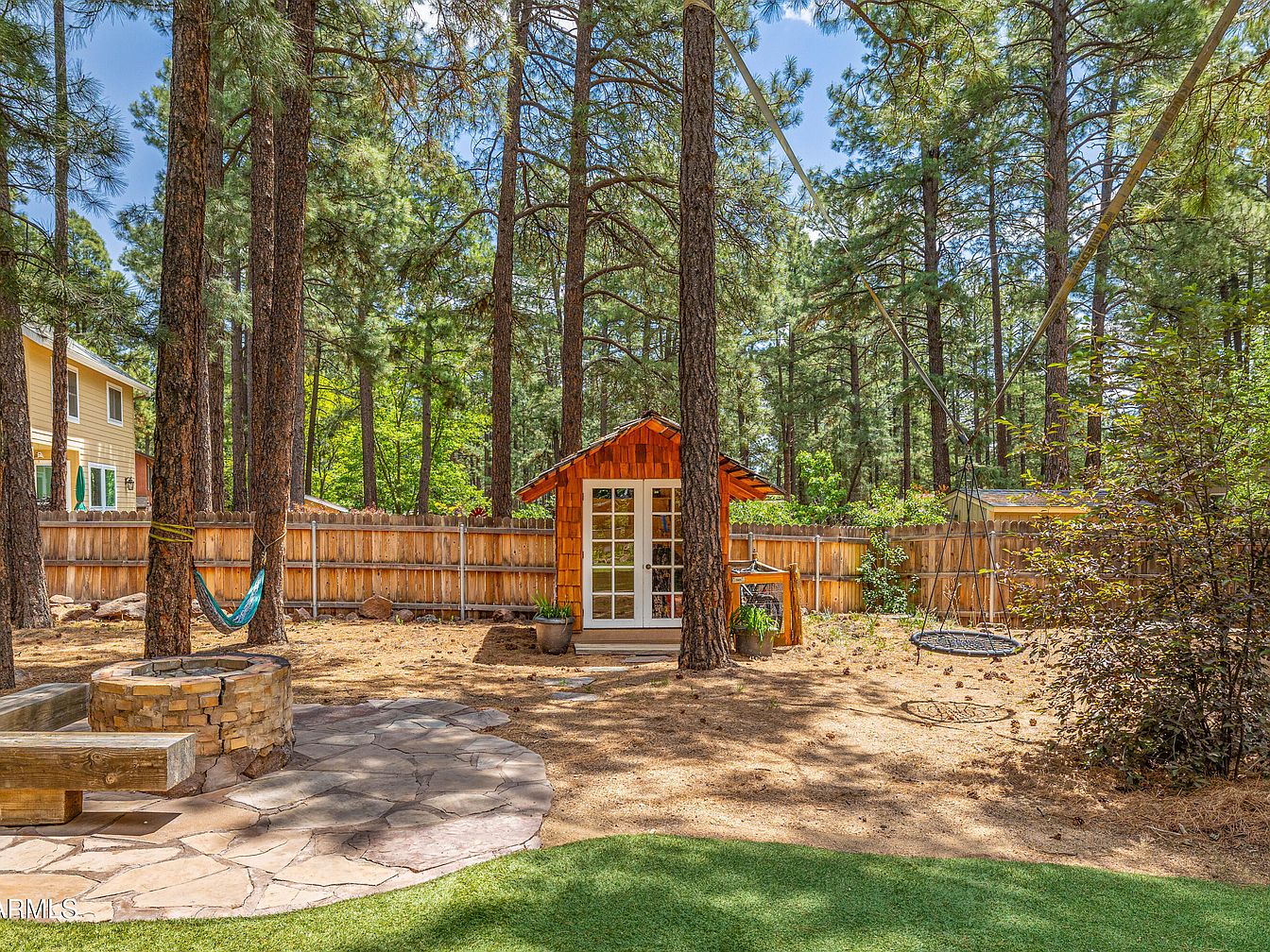 This tranquil backyard space blends rustic charm with playful features, framed by tall pine trees and a wooden privacy fence. The ground is a mix of natural dirt, pine needles, and a small patch of lush green artificial turf. Central to the area is a cozy wooden playhouse with shingled exterior and French doors, inviting for children’s imaginative play or quiet retreats. Adjacent, a circular stone fire pit with built-in wooden seating offers a cozy spot for gatherings. Two swings, one a hanging hammock and the other a circular platform swing, add dynamic fun beneath the towering trees, all creating a warm, nature-inspired backyard escape.